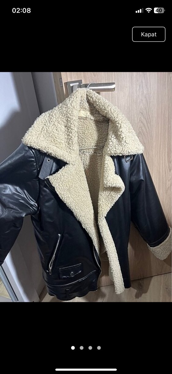 Yumuşak kürk detaylı siyah deri ceket, kesik yakalı, bol kesim ve midi boyda. Trendy günlük stil için uygundur. Defosuz
