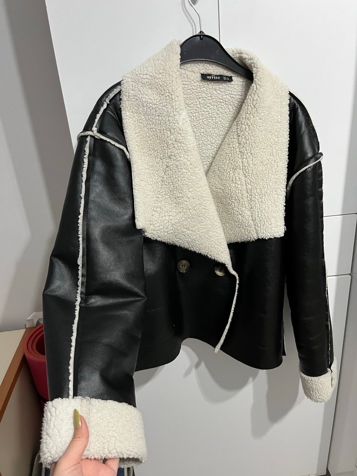 Fitted kesim siyah deri ceketin büyük yakası ve manşetlerinde kürk detayları bulunur. Temiz kullanıldı oversize üründür s beden yazmakta etikette fakat m ye de olur bol oversize bi modeldir.