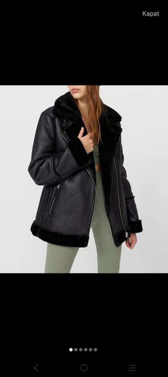 Kürklü yakası, manşetleri ve etek ucu olan siyah deri, dar kesim kadın ceket. Çıtçıtlı yaka ve askılı kollarıyla sokak stiline uygun.