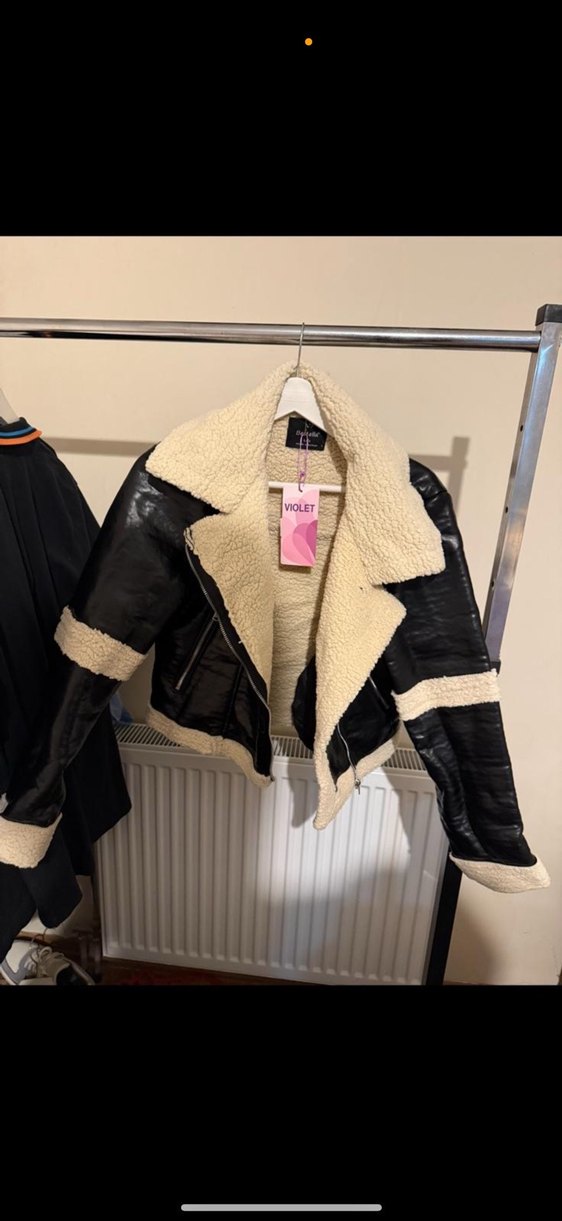 Bu dar kesim siyah deri ceket, parlak yüzeyi ve yaka, manşetler ile iç astarında kürk detaylarıyla dikkat çekiyor. Açık yakalı ve askılı kollu, midi boyda, günlük kullanıma uygun Paris sokak modası tarzında.