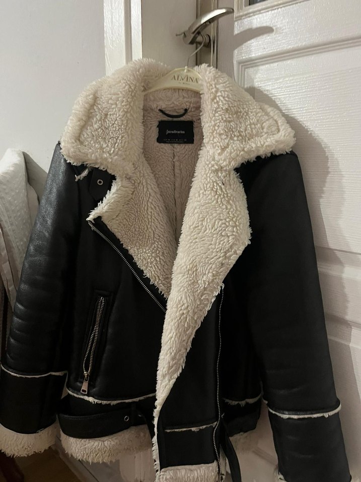 Fitted kesim siyah deri kadın kışlık ceket, kürklü ve notched lapel yakaya sahip. Strappy kollu, midi boy, biker tarzıyla rahat ve şık bir görünüm sunar.