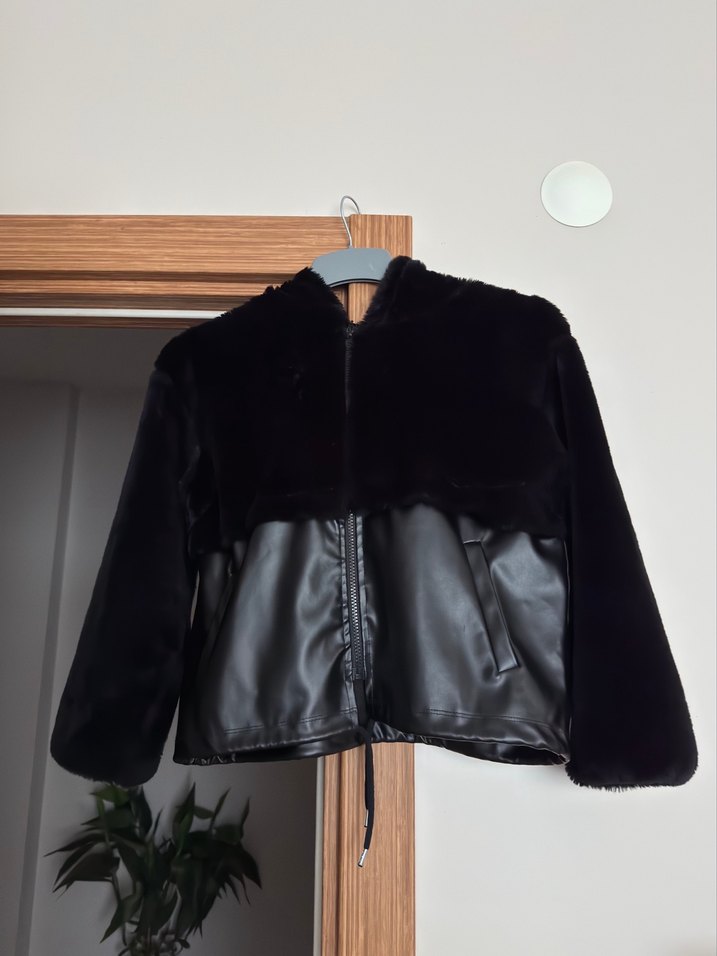 Kürklü detaylara ve kapüşona sahip siyah deri ceket, rahat kesimi ve kısa boyuyla sokak modasına uygun. Uzun kollu ve desensiz tasarım.