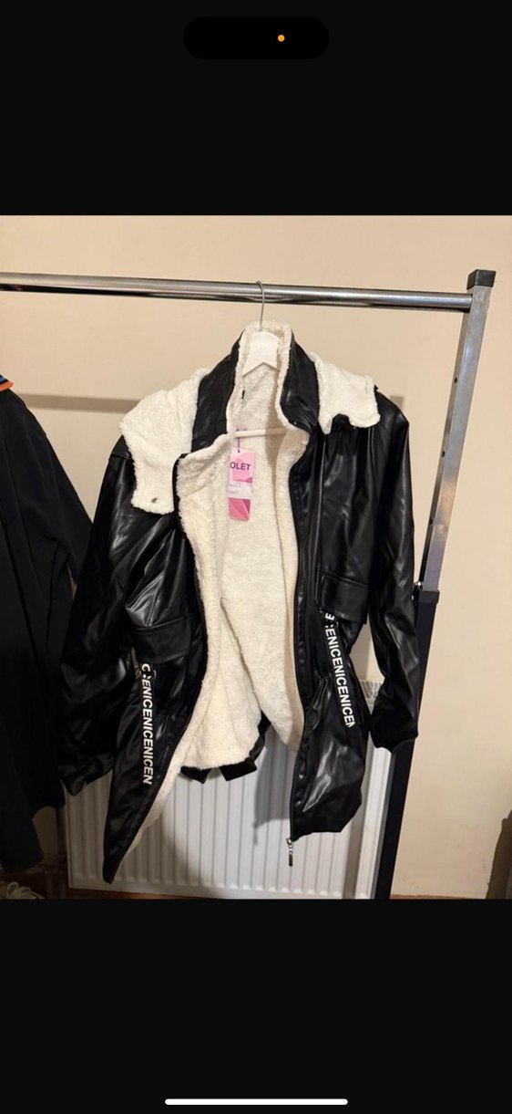 İç ve yaka kısmı kürklü, siyah deri midi ceket. Straplez yaka ve askılı kollu, bol kesim. Sokak stili için baskılı detaylar içerir.