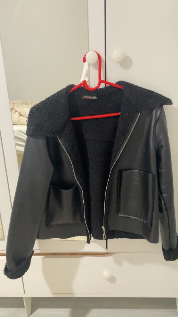 Dar kesim siyah deri mini ceket, uzun kollu ve yakası kürklü, rahat ve şık sokak stili sunar.