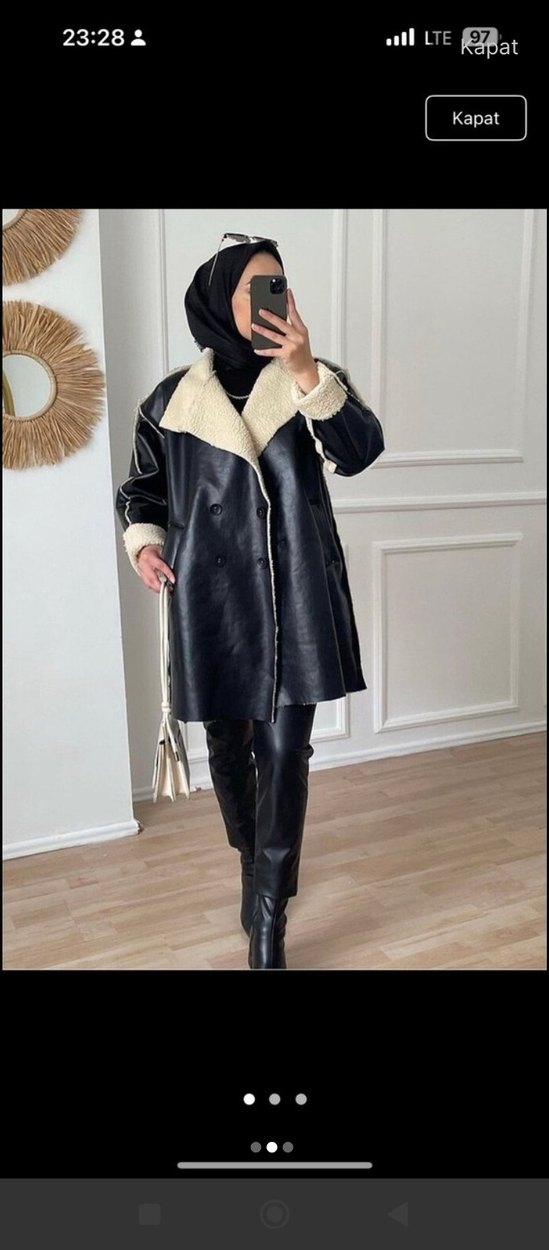 Kürklü yaka ve manşet detaylı, siyah deri uzun kaban. Notlu yaka ve uzun kollu, rahat kesim trendy günlük kullanım için uygun.