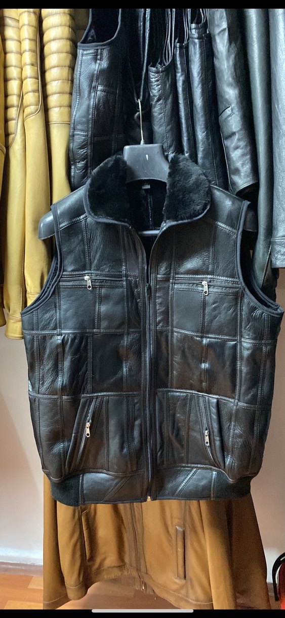 Kürklü yakalı, fermuarlı cepli, siyah deri biker yelek. Normal midi boyda ve dar kesimdir, sokak stili için uygundur.