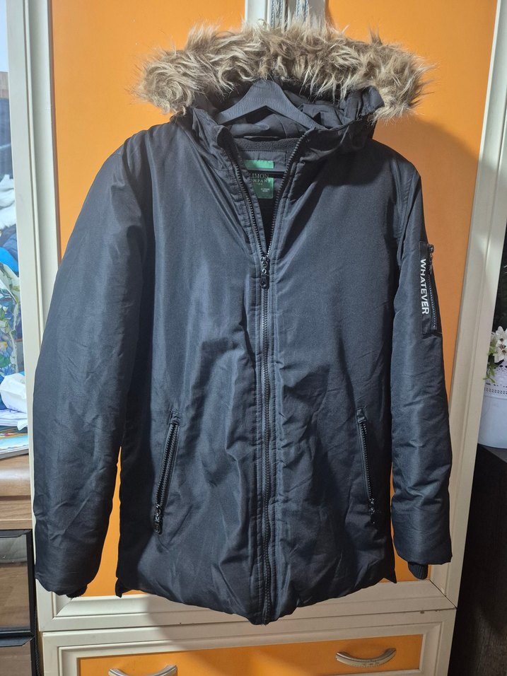 Kürklü kapüşonlu, siyah ve dar kesim erkek sokak tarzı mont. Uzun kollu, midi boyda, yumuşak ve sıcak kumaştan, dış mekan kullanımı için uygun.