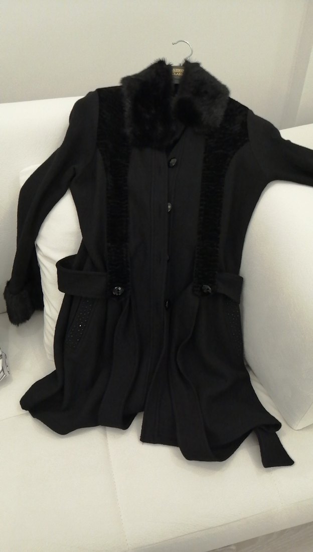 Yaka ve manşetlerde yumuşak kürk detaylı, düğmeli ve bel kemerli siyah kaban. Sıfır ürün.. Cep kenarlarında siyah taşları car.. Yaka kürkü çıkabilir.. Omuzdan Bel kemerine kadar astragan görünümü verilmiş düğme detayında kol ucu kğrkğne kadar harika bir kışlık kaban.. Hem çok şık hem ağır değil.. Arkasında da astragan görünümü ve siyah taşları mevcut..