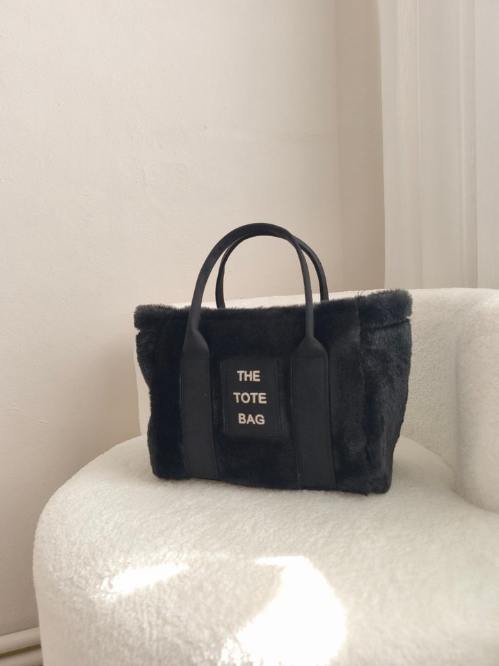 Siyah kadın çantası, yumuşak kürk detaylı dış yüzeye ve 'THE TOTE BAG' yazılı baskıya sahiptir. Günlük kullanıma uygun, rahat ve sokak modası tarzında.
