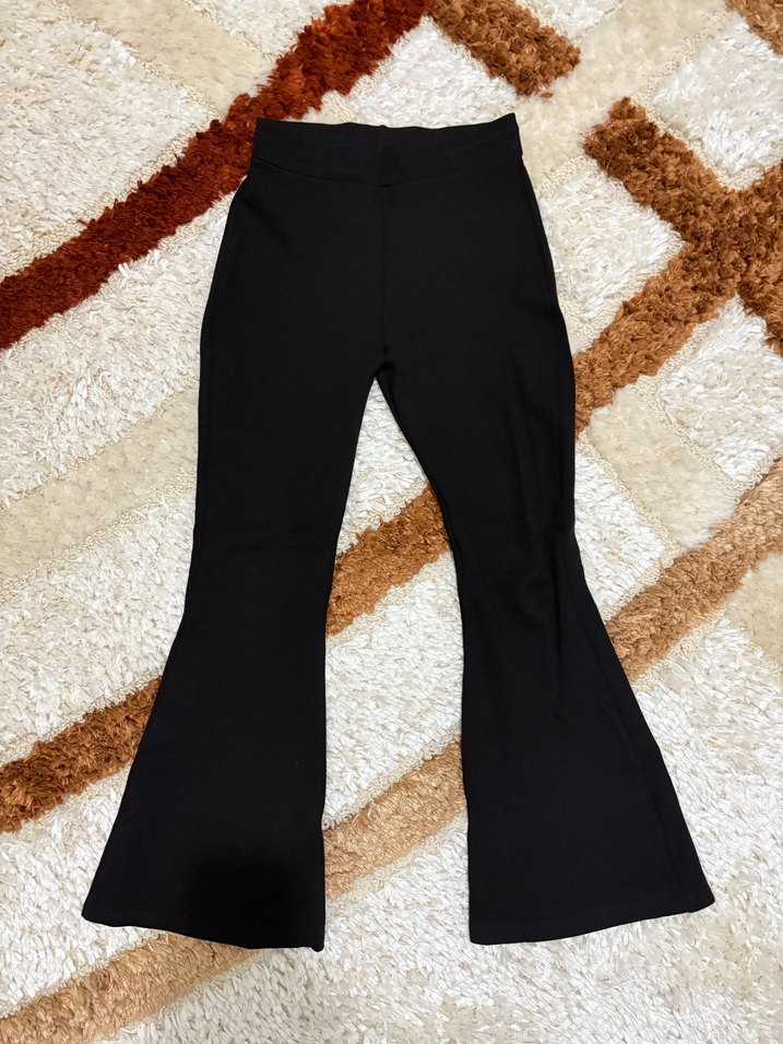 Siyah, kürklü detaylı, yumuşak sentetik kumaştan yapılmış, rahat ve şık ispanyol paça pantolon. Günlük kullanıma uygundur.