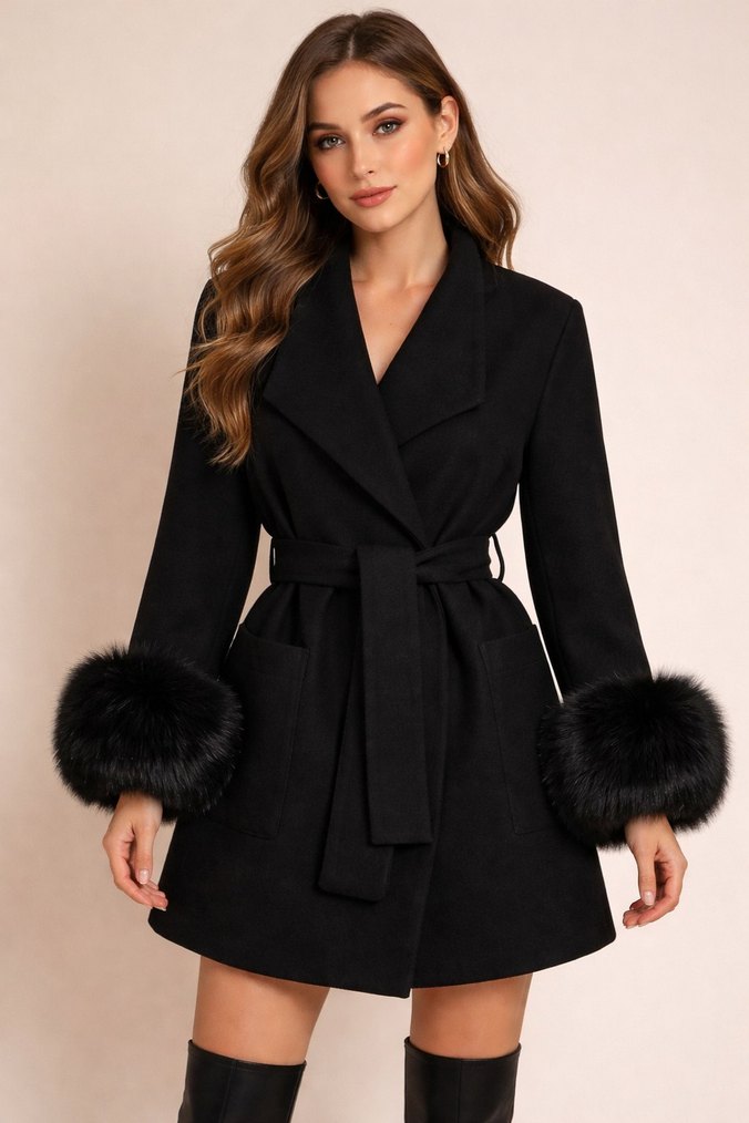 Siyah tilki kürklü manşetli kadın kaban. Uzun kollu, regular fit ve yumuşak dokulu kumaştan, beli kuşaklı, şık ve rahat bir model. Standart bedendir