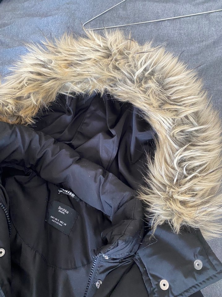 siyah renkte, kürklü kapüşonlu kış montu. Sentetik kumaştan, sokak tarzı ve rahat bir kullanım sunar.s rengi siyahtir cepleri deliktir