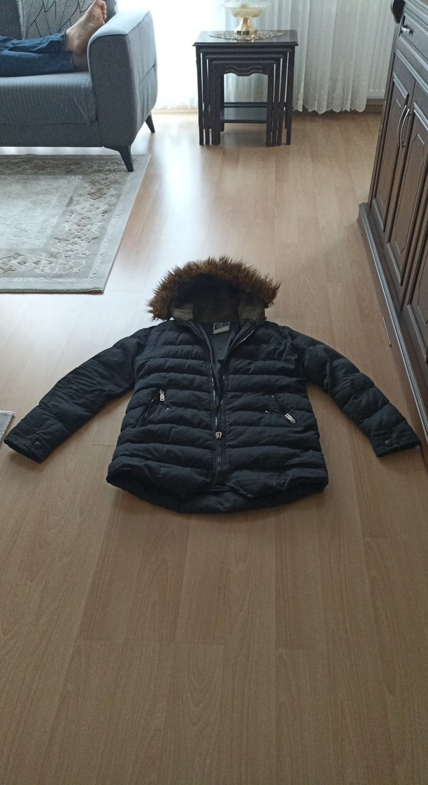 Kürklü kapüşonlu, siyah, normal boyda, fitted kesim kadın kışlık mont. Notch yaka ve uzun kolludur, günlük kullanıma uygundur.