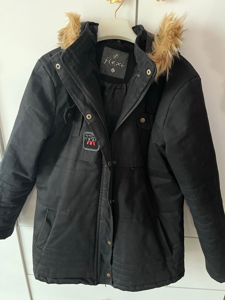 Siyah, kürklü kapüşonlu ve baskılı desenli, uzun kollu, normal boyda, fitted kesim kadın kışlık mont. Yumuşak iç yüzey günlük kullanıma uygun.