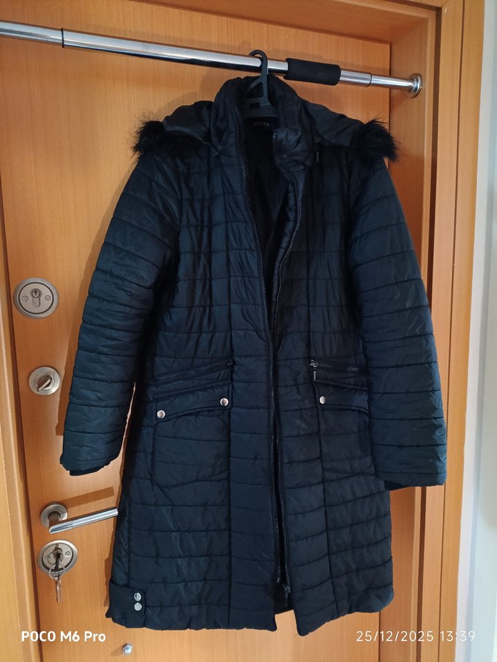Kürklü detaylı, uzun siyah kadın kışlık mont. Dar kesim, askılı kollu ve yakası kesik yaka. Yumuşak sentetik kumaştan, rahat sokak stili için uygun.