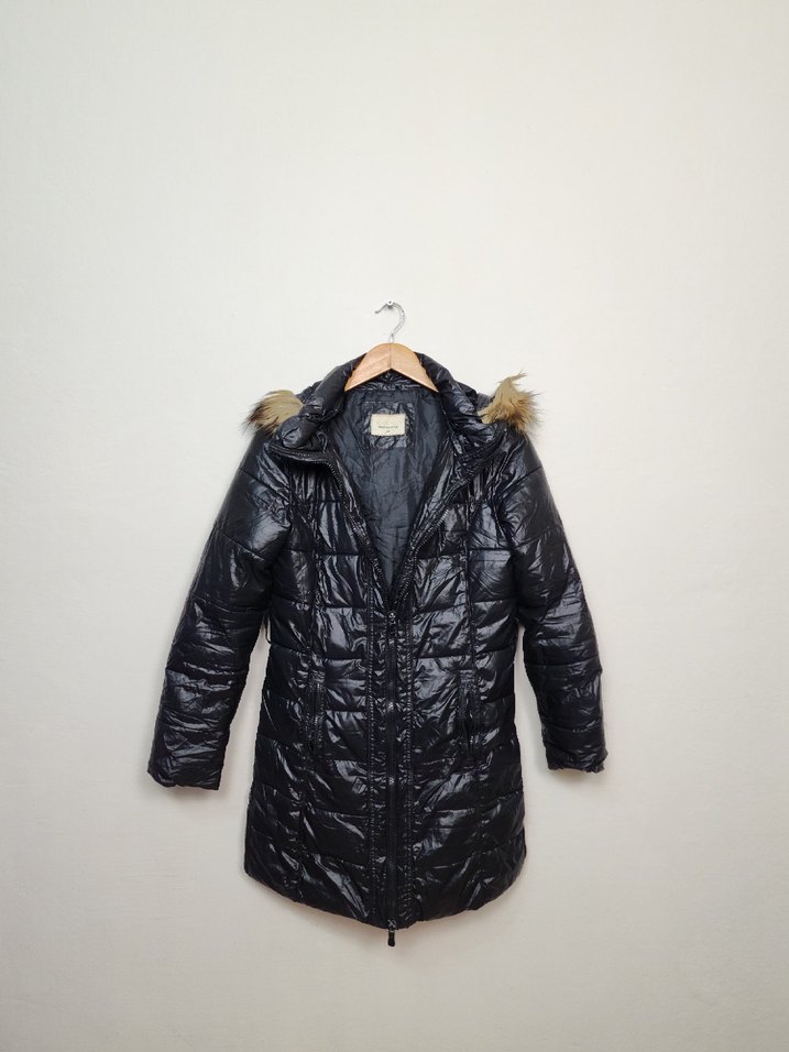 Kürklü kapüşonlu, uzun kollu siyah kadın kışlık mont, yumuşak sentetik kumaştan, midi boyda, rahat ve şık dış mekan kullanımı için uygun.