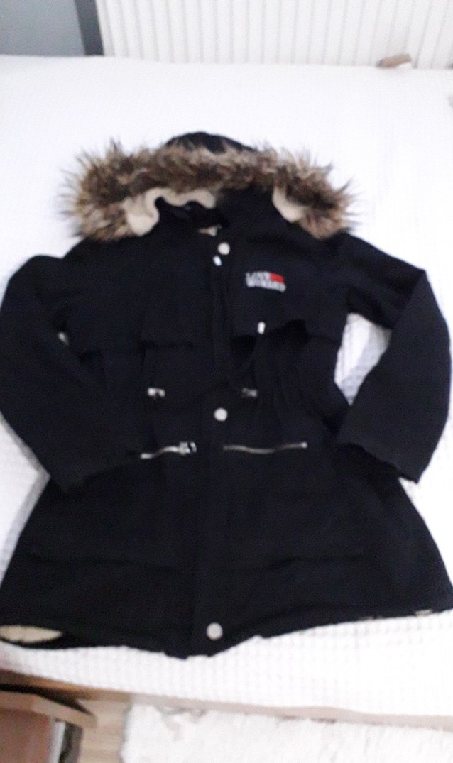 Uzun kollu, kürklü kapüşonlu, siyah kadın kışlık mont. Midi boy ve rahat, yumuşak kumaştan, günlük kullanıma uygun şık kesim.44 yazıyor 38 44 arasi uygundur belden büzmeli kürklü sıcacık