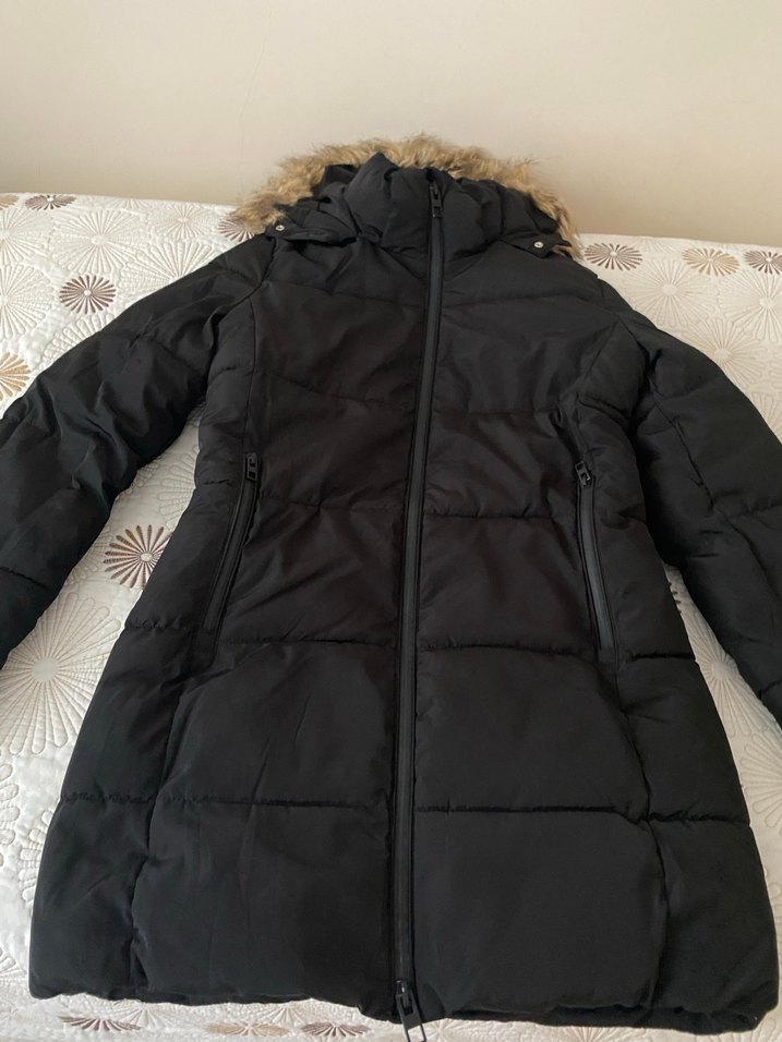Kürklü kapüşonlu, uzun kollu siyah kadın mont. Yumuşak sentetik kumaştan üretilmiş, günlük kullanıma uygun rahat ve şık. Omuzdan etek ucuna kadar 86 cm