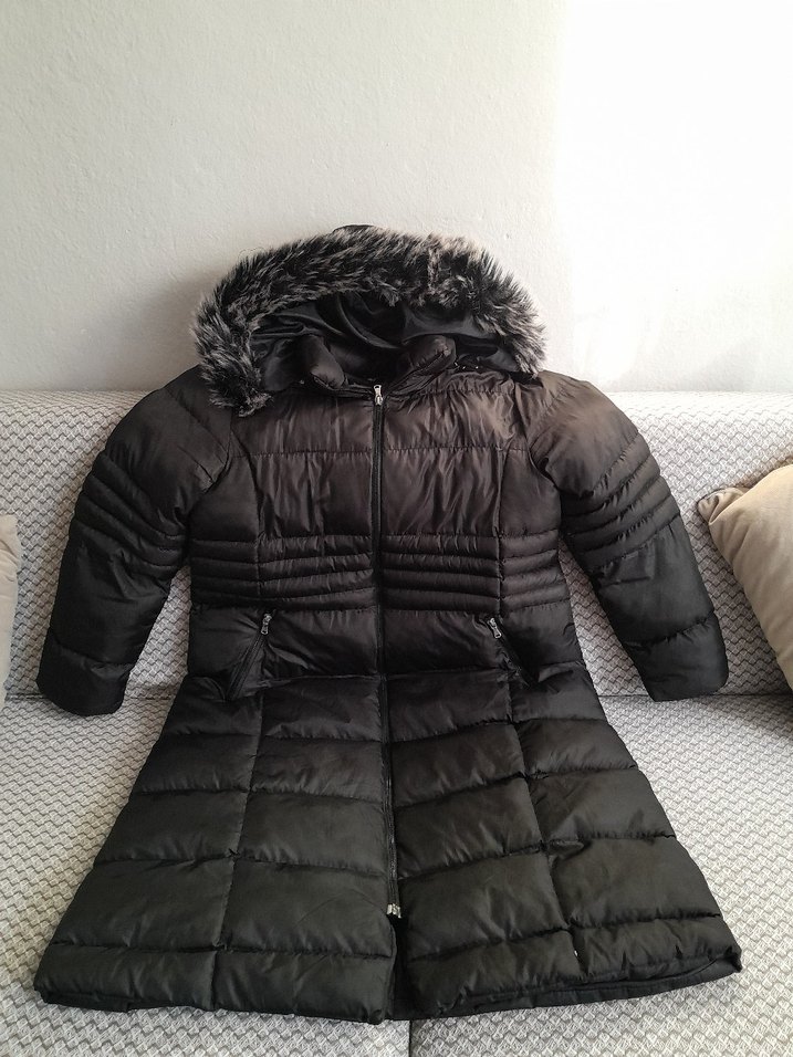 Fitted kesim, uzun siyah kışlık mont, kürklü kapüşon ve notched yaka detayına sahip. Yumuşak sentetik kumaştan üretilmiş, günlük sokak stili için ideal.