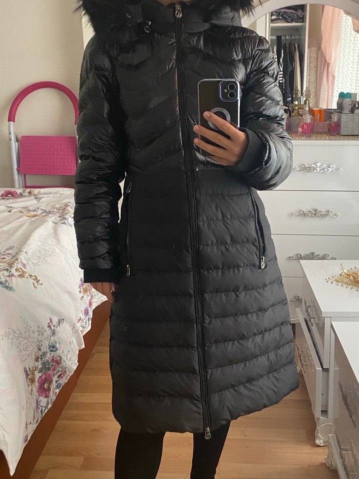 Kürklü kapüşonlu, siyah, dar kesim midi kaban. Uzun kollu ve günlük kullanıma uygun, rahat sokak stiliyle uyumlu.