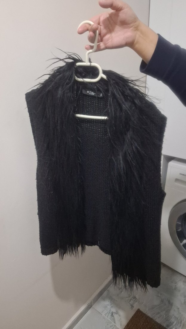 Fitted kesim, siyah yün yelek, yakasında kürk detaylıdır. Kollarsız, midi boyda ve günlük kullanıma uygundur.