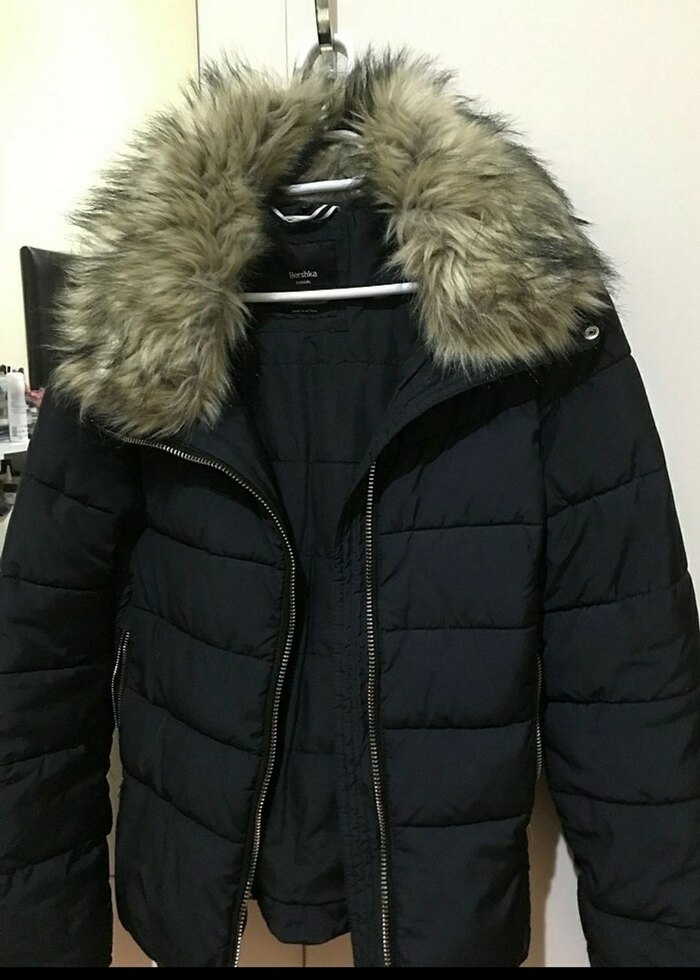 Bershka marka siyah, kapüşonlu ve kürk detaylı, yumuşak ve sıcak tutar, bel üstü S beden, fermuarlı, fitted kesim kadın kışlık mont.