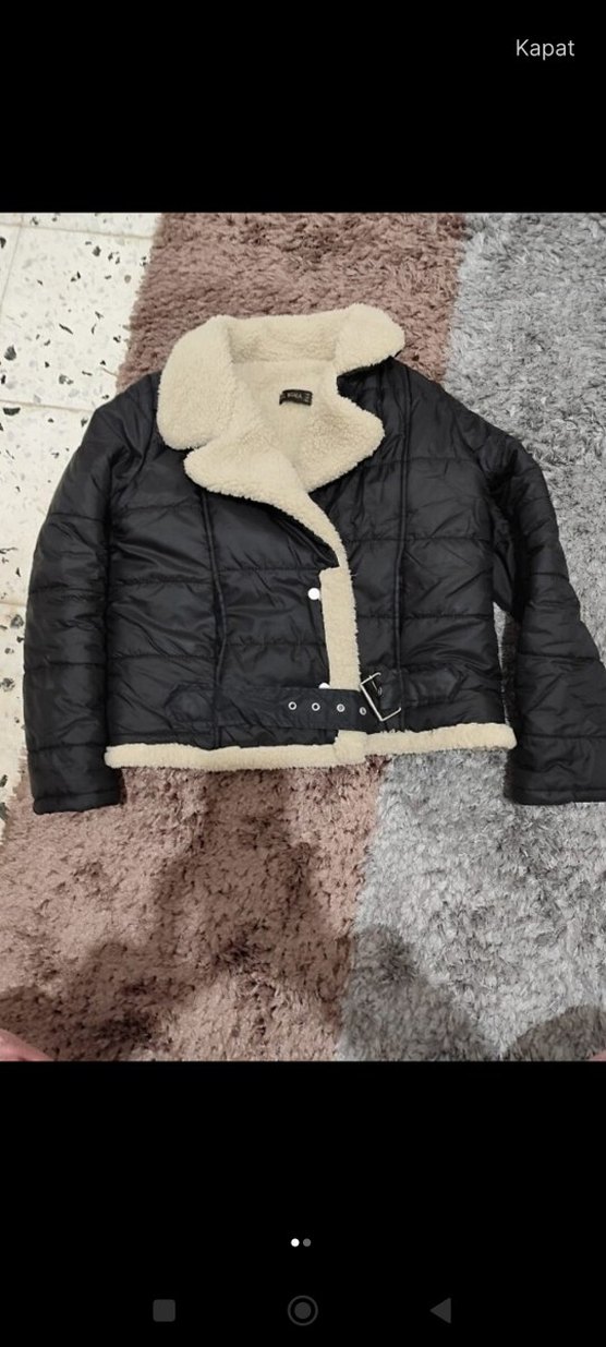 Kürklü detaylı, kısa kesim, siyah kadın kış ceketi. Yumuşak kürk yakası ve fleece kumaşı ile sıcak tutar. Strappy kollu, fit kesim, günlük sokak stili için uygun.