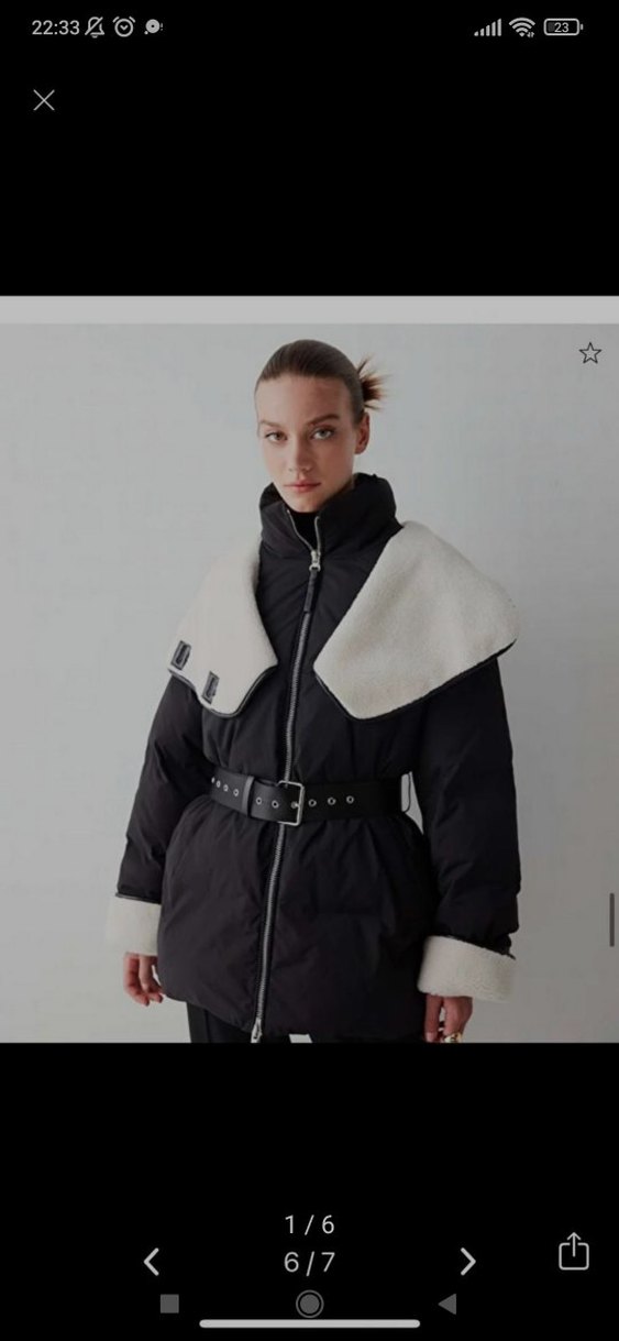 Siyah kısa kışlık mont, yakasında ve manşetlerinde kürk detaylarına sahiptir. Belde kemerli, bol kesim ve askılı kolludur, sokak stiline şık bir dokunuş katar. ❄️