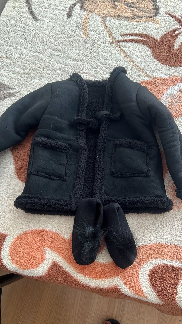 Uzun kollu, kesimli ve kürklü detaylara sahip siyah kız çocuk ceketi. Yumuşak ve sıcak kumaştan, günlük kullanıma uygun rahat bir sokak stili parçası.