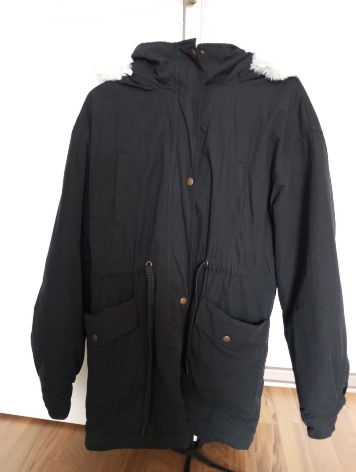 Kürklü detaylı, siyah midi uzunlukta kadın ceket. Gevşek kesim, uzun kollu ve cepli, yumuşak ve sıcak kumaştan üretilmiştir. Rahat sokak stili için uygundur.