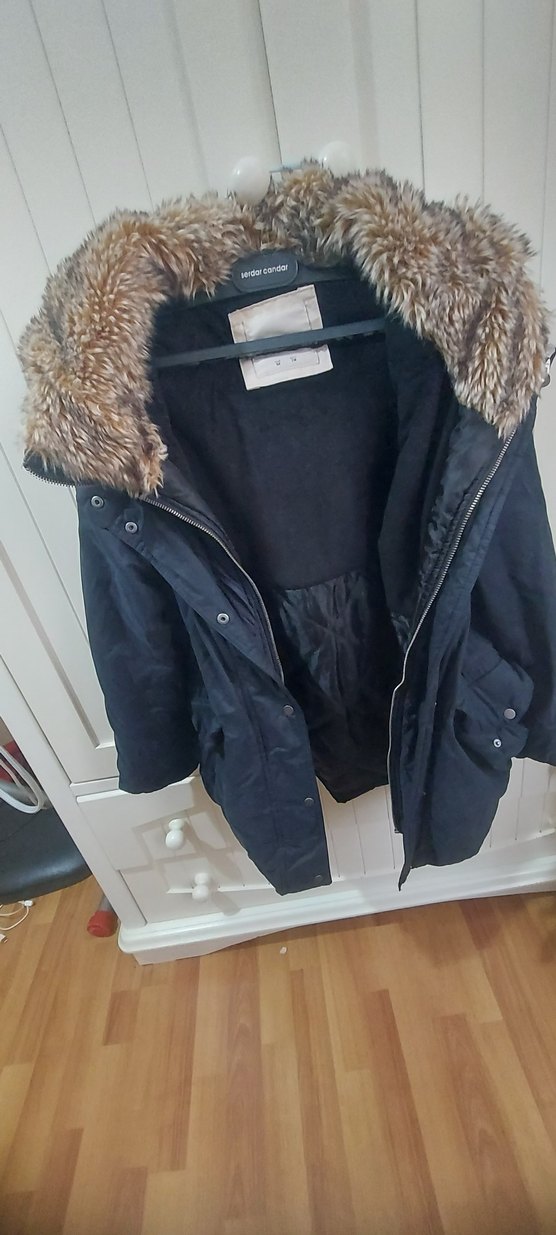Siyah midi uzunlukta, bol kesim kadın mont. Yakasında kürk detaylı, kesik yaka ve uzun kollu, yumuşak ve sıcak kumaştan üretilmiştir.