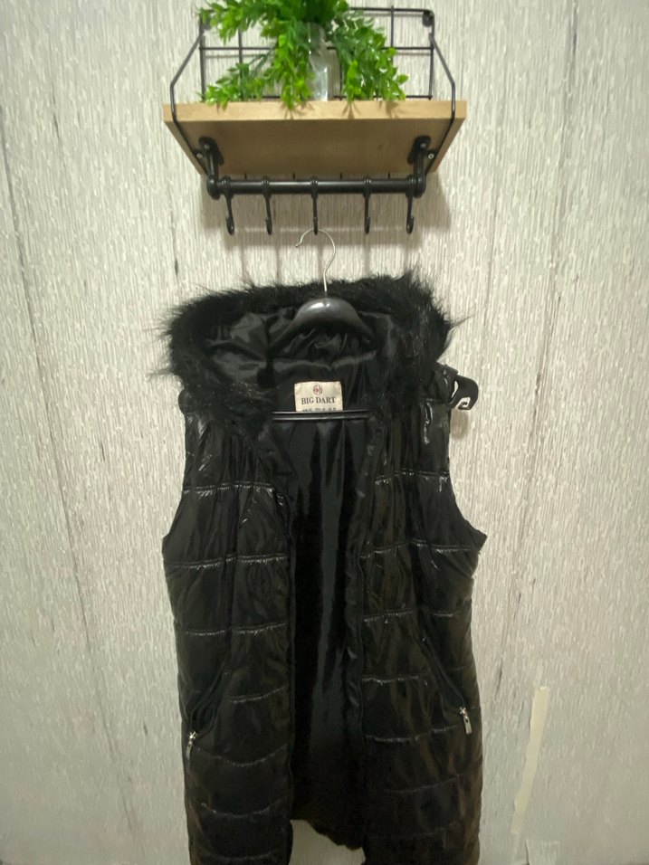 Bu siyah, vücuda oturan yelek, yüksek yakalı ve kürk detaylıdır. Kolsuz, baskılı desenli ve yumuşak, sıcak kumaştan yapılmıştır.