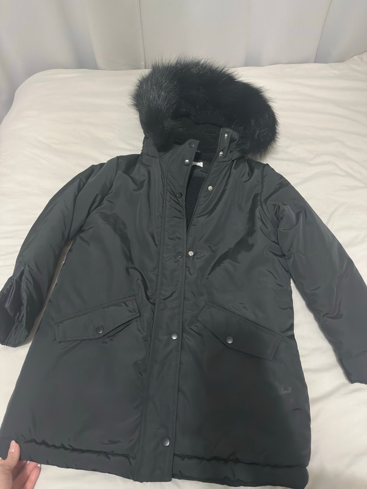 13,14 yaş olup sml giyen birine de olmaktadır. siyah, kürklü kapüşonlu, uzun kollu ve kesimli kışlık midi boyda olup, rahat ve sıcak fleece astarlıdır.