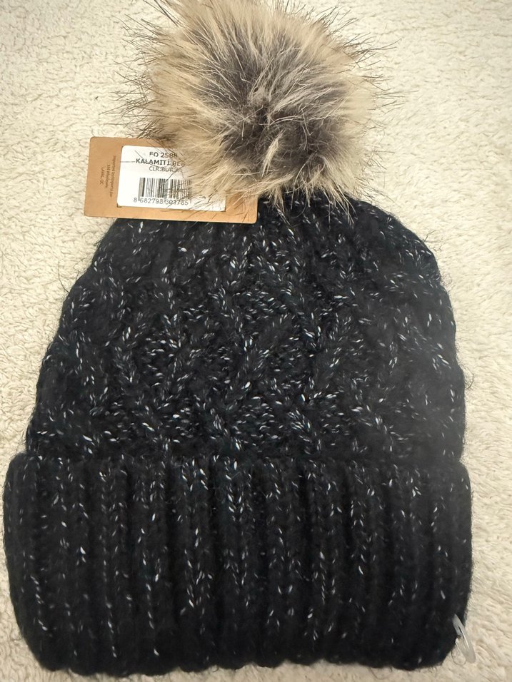 Siyah simli yün kadın bere, yumuşak örgü ve kürklü ponpon detayıyla rahat sokak stili için uygundur.