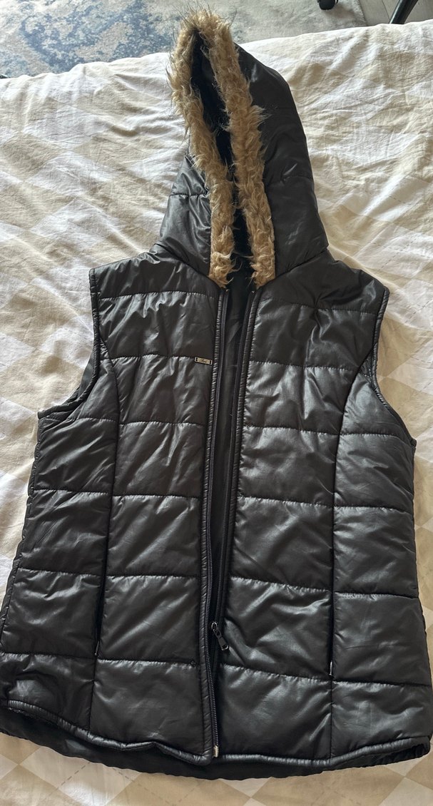 Siyah dkolsuz yelek, kapsonu kürk detaylıdır. Fitted, midi boy ve günlük rahat stil için uygundur.