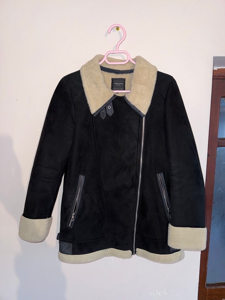 Kürklü detaylara sahip siyah süet ceket, kesik yaka ve uzun kollu. Fitted kesim ve midi boy, günlük kullanım için uygun. Zara marka
