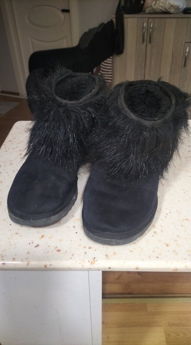 Kürklü detaylı, siyah süet kadın botları, dolgu topuklu. Desensiz tasarımı bohem ve retro stillere uygun, günlük kullanım için sıcak ve rahat.