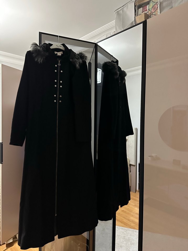 Siyah uzun kaban, yakasında kürk detayları ve keskin yakası ile dikkat çekiyor. Yumuşak ve sıcak kumaştan üretilmiş, regular fit ve uzun kolludur. Boy 1,35 en 48,5
