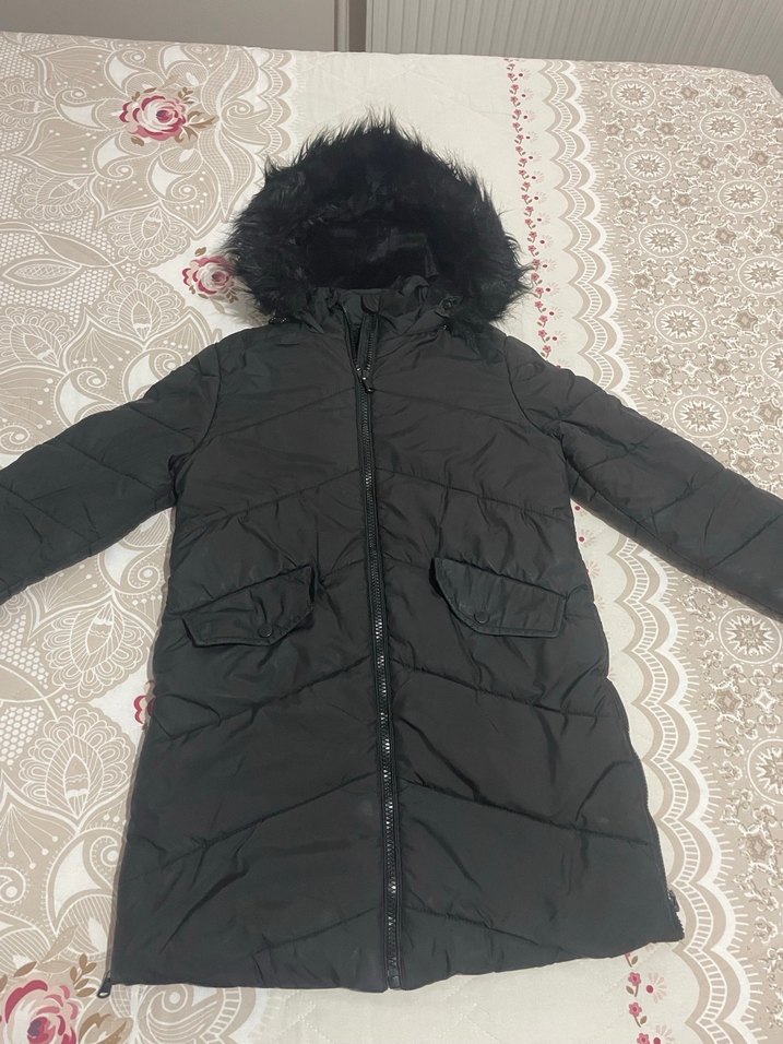 Siyah, uzun kollu, kürklü kapüşonlu ve kesimli yapısıyla sıcak tutan kadın kışlık mont. Sentetik kumaştan, günlük rahat kullanım için uygun.
