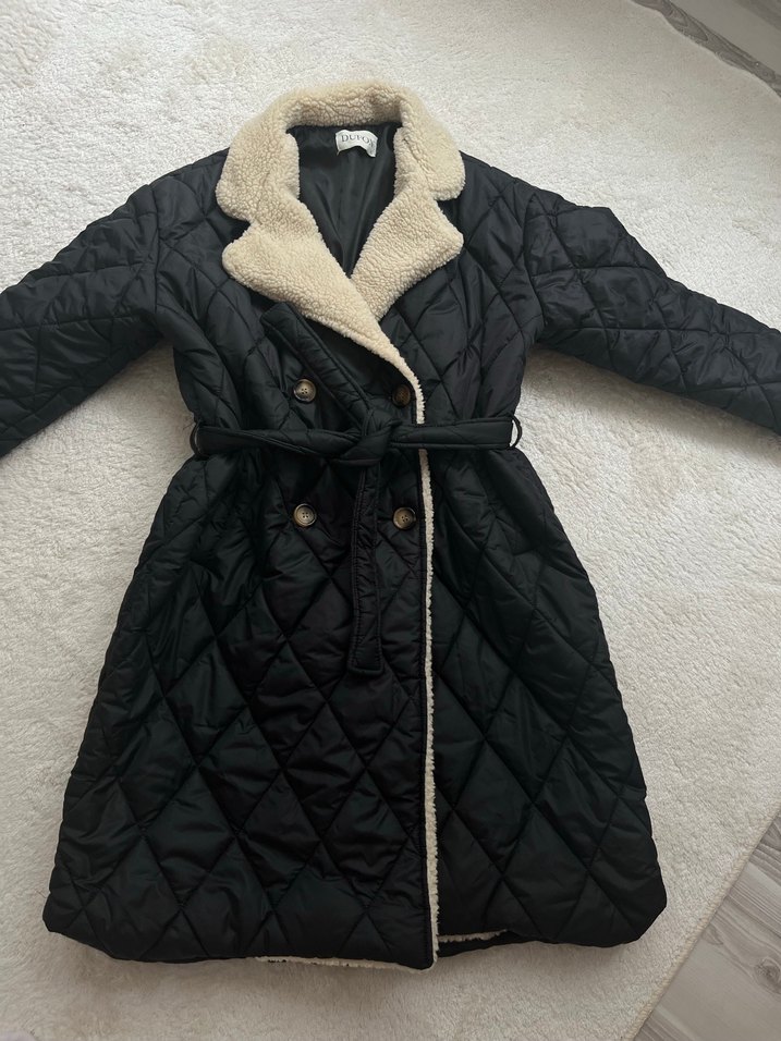 Kürklü detaylı, kapitone desenli siyah uzun kadın mont. Normal kesim, askılı kollu ve kemerli, rahat sokak stili için uygundur.