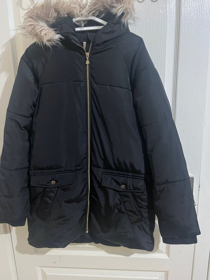 Kürklü kapüşonu ve kesimli yaka detayı olan siyah, uzun kollu, diz üstü uzunlukta, rahat sentetik kumaştan kız cocuk mont