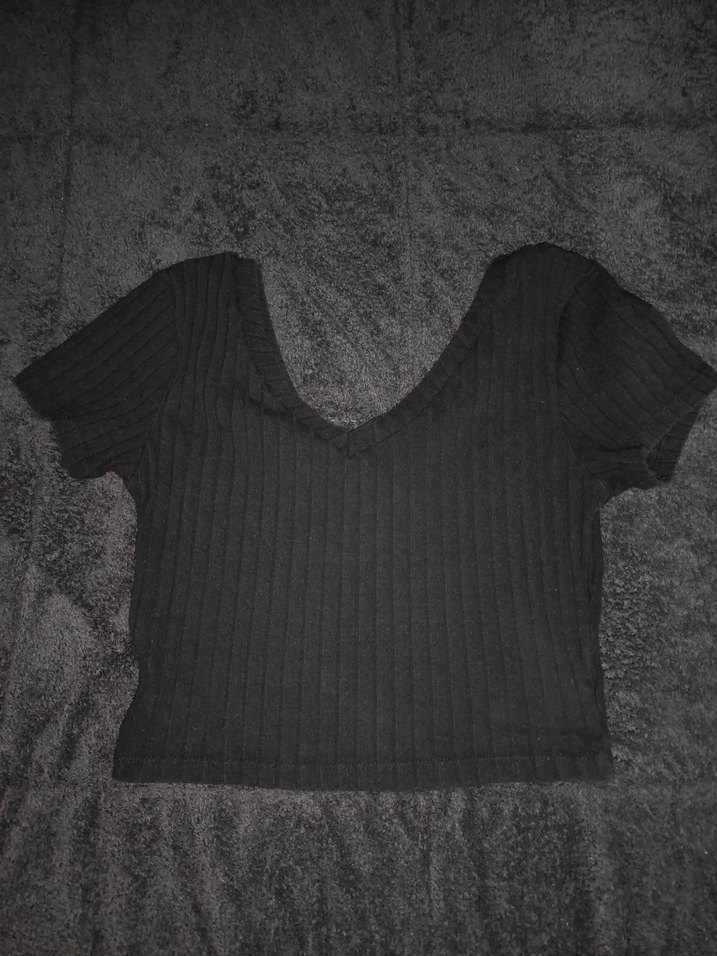 Kürklü Siyah V Yaka Kısa Kollu Crop Top