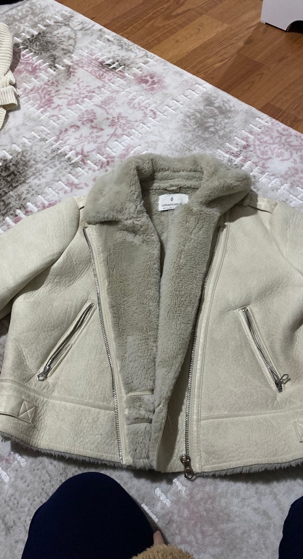 Kadın ceket, süet dış yüzey ve kürk detaylı iç kısım ve yakaya sahiptir. Dar kesim, uzun kollu ve kırmalı yakalıdır. Bej ve gri tonlarında, midi boyda, fermuarlı cepler içerir.