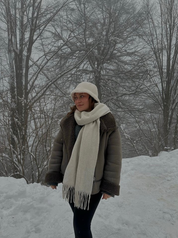 Kürklü detaylı, normal boy, süet kumaşlı bol kesim ceket. Kahverengi tonunda, rahat sokak giyimi için ideal. Kalın kışın çok rahat giyilebilecek cekettir. Zaranın çok popüler modelinin muadilidir.