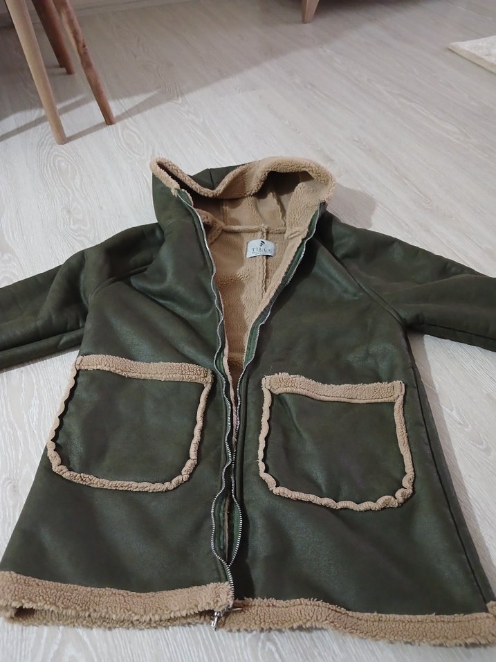Yumuşak süet kumaştan, bol kesim kadın ceketi. Uzun kollu, kürk detaylı, cepleri ve kenarları kürklü. Notlu yaka ve normal midi boyda, rahat sokak stili için uygun. Gri tonlarında, sıcak tutar.