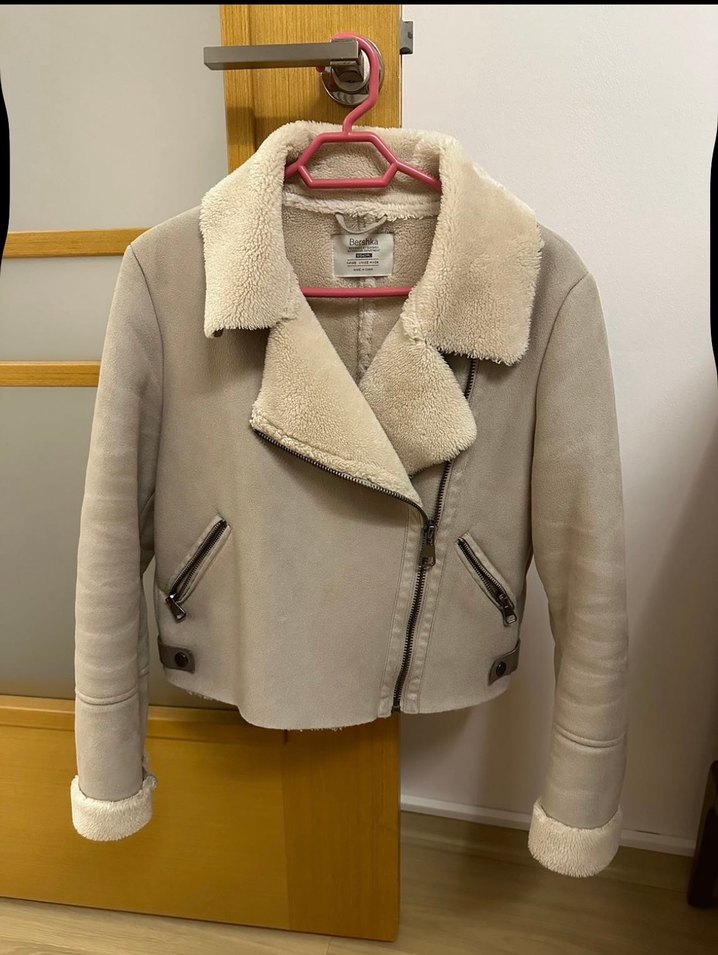 Yumuşak süetten yapılmış, kürklü yaka ve manşet detaylarına sahip, kısa kesim ve dar kesim kadın cekettir. Bej renkli, sokak modasına uygun rahat bir tasarımdır.