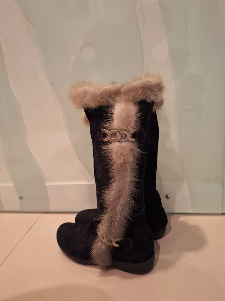 Koyu kahverengi süet kadın botları, kürk detaylı ve dolgu topuklu, gotik stil ile rahatlığı bir arada sunar.