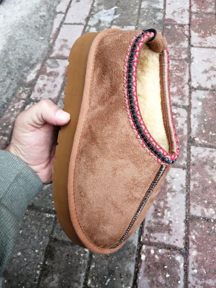 Kahverengi süet kadın terliği, dolgu topuklu, kürk detaylı ve nakış işlemeli. Bohem tarzda, günlük kullanım için rahat bir model.