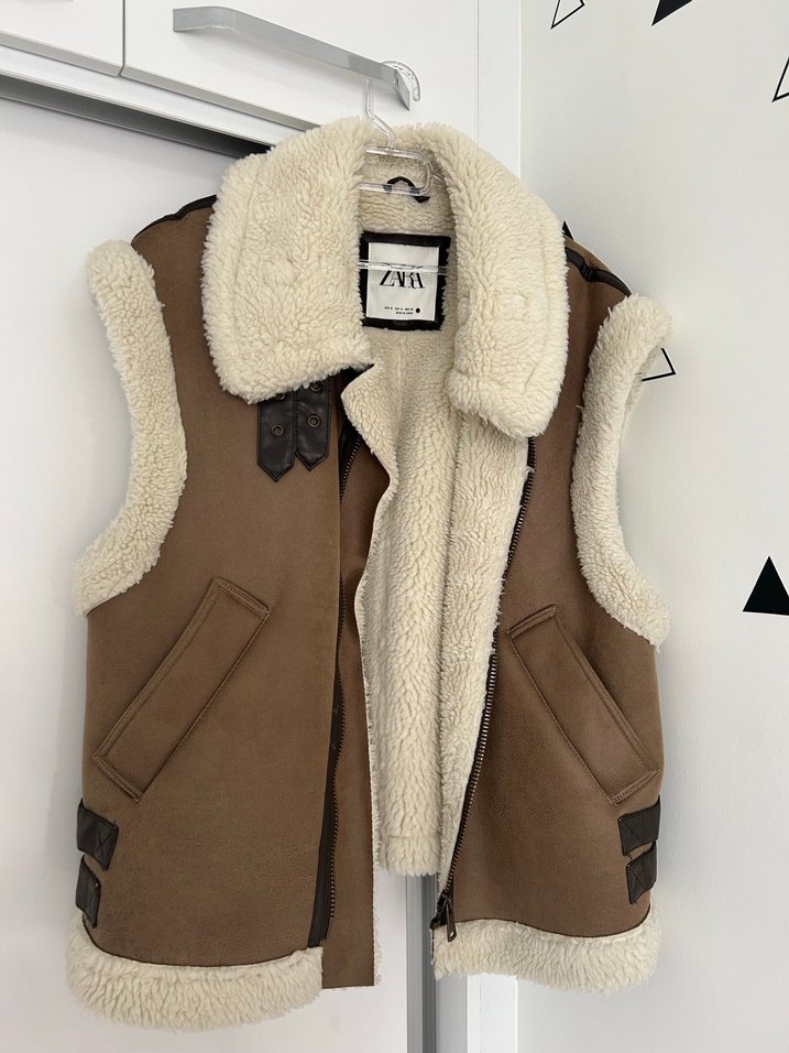 Kürklü detaylı, süet malzemeden yapılmış, kolsuz ve notched lapel yakalı, fitted kesim kahverengi yelek.
