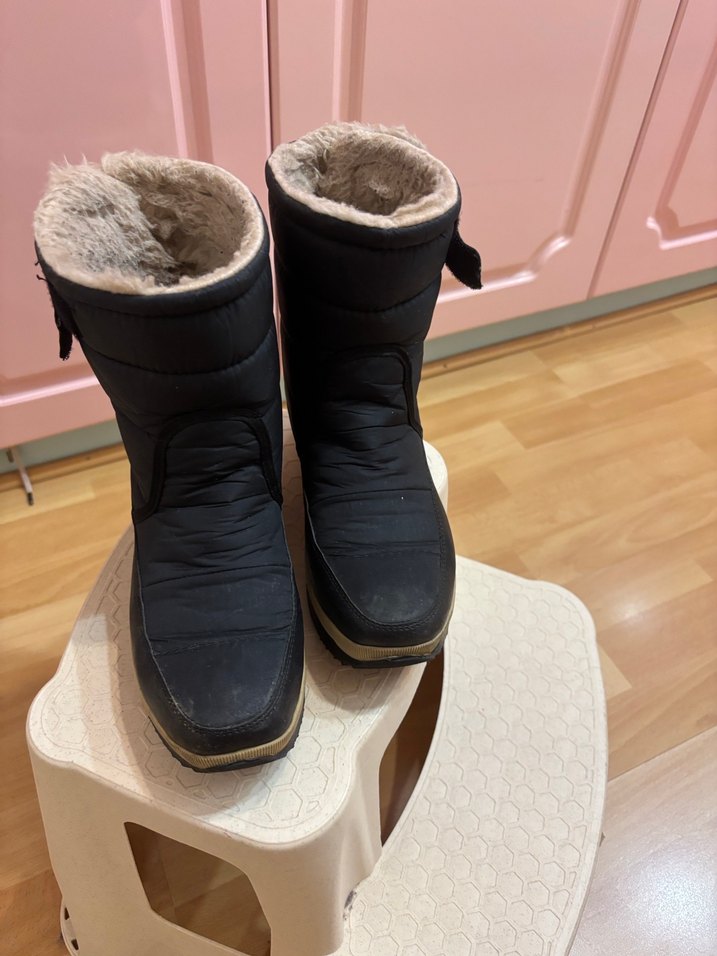 Kürklü iç astarı ve dolgu topuklu kauçuk tabanı olan koyu kahverengi kadın kar botları, günlük rahat kullanıma uygundur. Sıcacık kullanım sağlar. Ufak tefek aşınmalar vardır ,boyanarak temizlenir